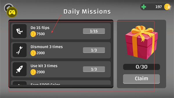 2、日常任務界面包含多個目標如完成15次翻轉、3次卸除動作等,達成任務可獲得金幣獎勵,右側禮盒需累積進度后領取額外獎勵。
