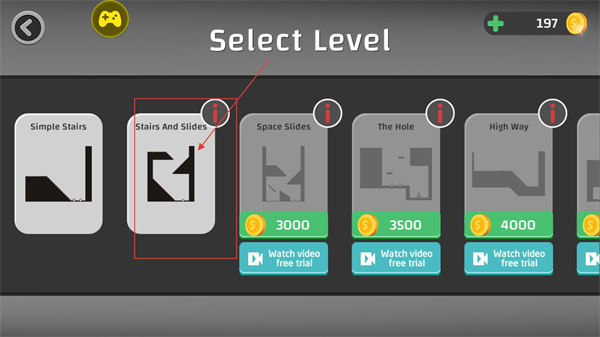 3、在關卡選擇界面中,樓梯與滑道等關卡需消耗金幣解鎖,也可通過觀看廣告體驗,不同關卡對應不同的地形與挑戰難度。