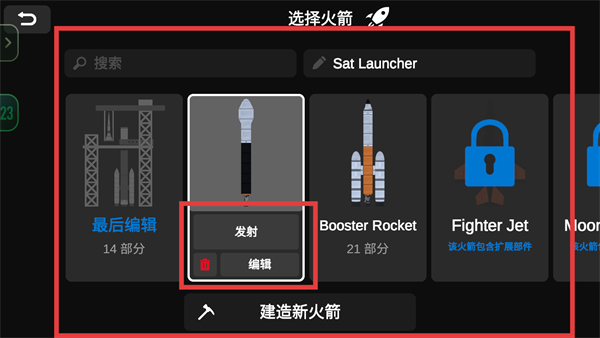 2、進入選擇火箭頁面,挑選已解鎖的火箭型號,選定后點擊發射按鈕可進入發射流程,也可點擊編輯按鈕調整火箭部件等。