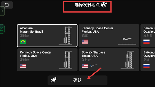 3、進入選擇發射地點頁面,從多個發射臺選項中選定目標地點,確認選擇后點擊確認按鈕,即可完成發射地點的選定,為火箭發射確定場地條件。