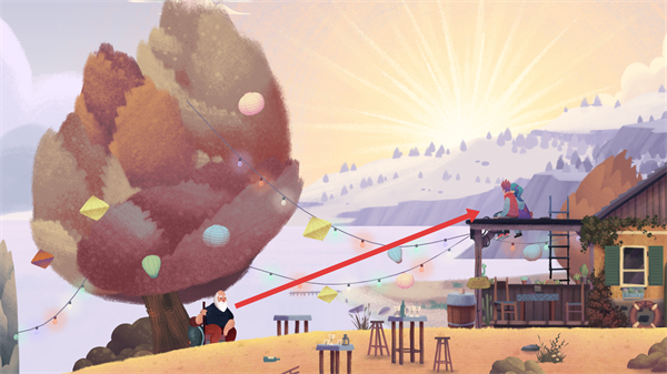 3、調整地形后,老人會移動到新區域,場景中的裝飾彩燈、桌椅對應劇情節點,游戲通過場景變化展現回憶,需持續推進角色移動解鎖更多敘事內容。