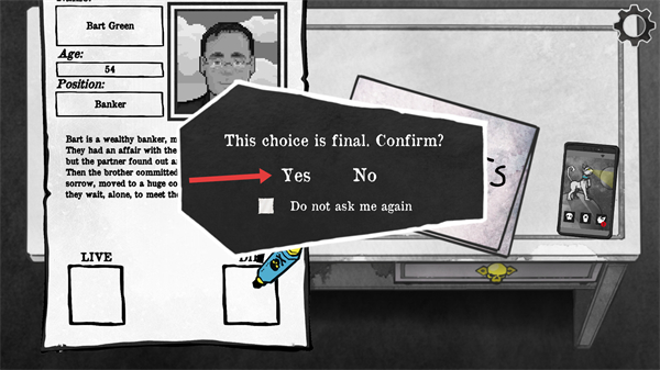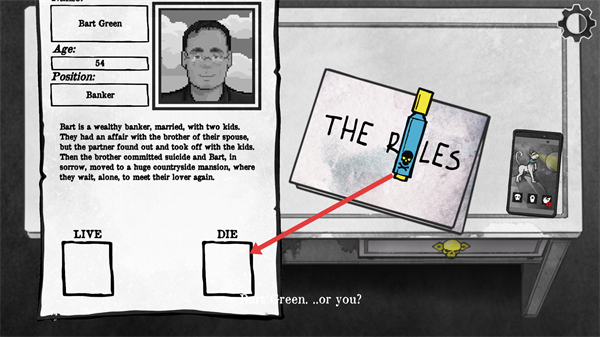 2、根據檔案信息,在LIVE或DIE選項中選擇對應的方框,該選擇會決定亡者的去向,不同選擇會觸發不同劇情分支,需結合角色經歷做出符合規則的判斷。