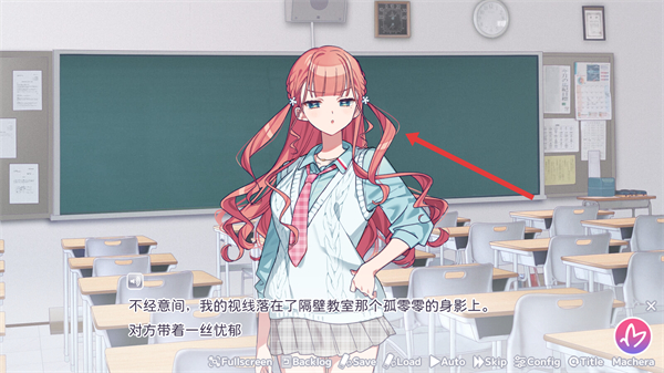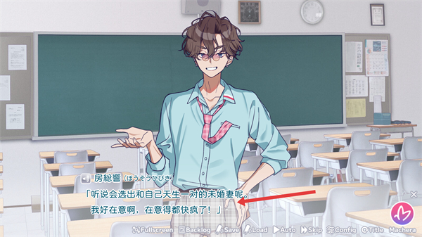 3、劇情推進至教室場景,會出現角色房総響的臺詞,其內容會鋪墊劇情設定,繼續跟隨對話流程,了解角色的核心設定,為后續互動做準備。
