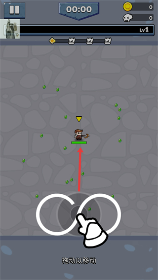 1、進入游戲后,通過拖動界面下方的操作區域控制角色移動,以此收集場景中的綠色道具,同時推進關卡進度,這是基礎的移動與資源收集方式。