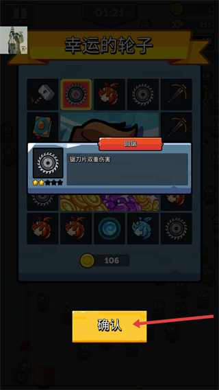 2、【幸運的輪子】界面中,獲得道具后點擊【確認】按鈕即可領取,如圓鋸這類道具可提供傷害加成,領取后會自動裝備,助力后續戰斗。