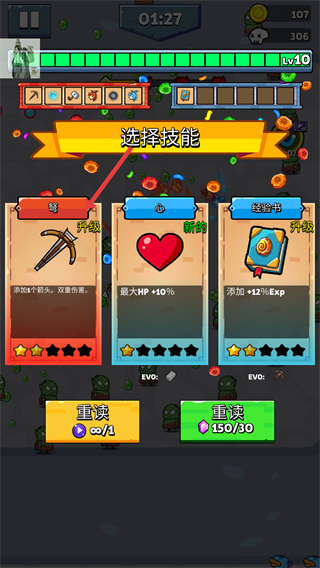 3、升級后會出現技能選擇界面,可挑選弩、心、經驗書等技能,優先選擇契合戰斗風格的技能,如弩能提升傷害,助力更快清理敵人。