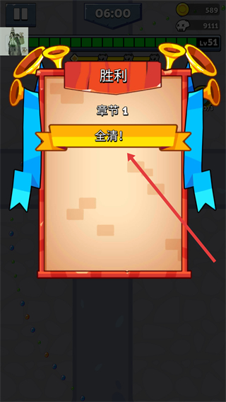 4、完成關卡后會顯示【勝利】界面,達成章節全清可解鎖后續內容,此時可結算獎勵并進入下一章,繼續推進游戲進程。