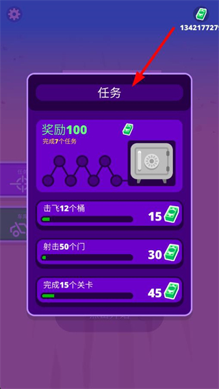 4、在任務界面可查看各類任務,如擊飛桶、射擊門等,完成任務能獲取對應的獎勵,助力游戲內的成長與發展。