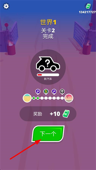 3、完成關卡后,顯示新汽車進度及獎勵,點擊下一個按鈕即可進入下一個關卡繼續游玩。
