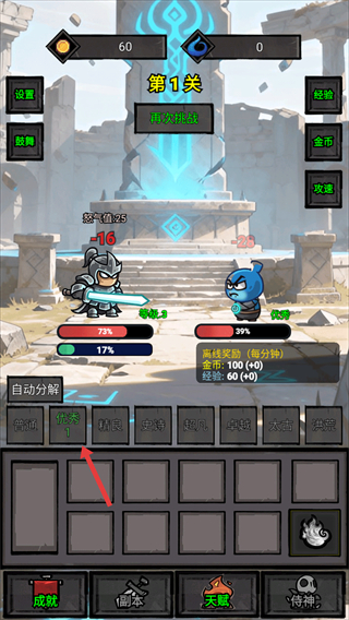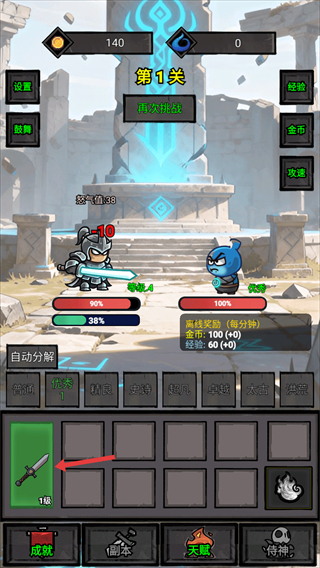 1、進入關卡后,可通過自動戰斗積累金幣與經驗,界面下方裝備欄可查看已獲裝備,點擊對應裝備可進行操作,優先推進關卡提升收益,同時關注怒氣值變化輔助戰斗。