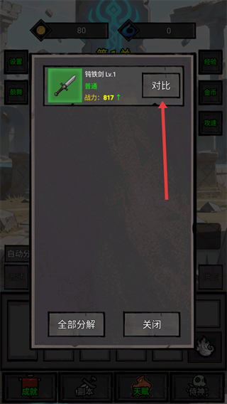 2、點擊裝備欄中的裝備,可打開詳情界面查看屬性,利用【對比】功能比對不同裝備的戰力加成,無用裝備可通過【全部分解】轉化為材料,助力后續裝備鍛造。