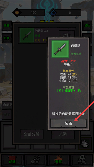 3、在裝備詳情界面,選擇屬性更優的裝備后點擊【裝備】按鈕完成替換,替換后舊裝備會自動分解,此操作可快速提升戰力,適配當前關卡的戰斗需求。