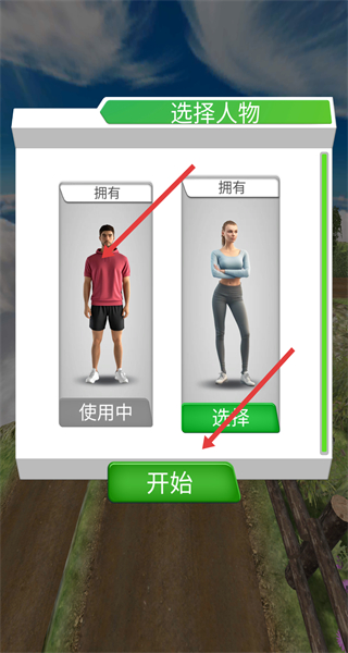 1、進入游戲后先在選擇人物界面挑選已擁有的角色,點擊對應角色下方的選擇按鈕完成選定,再點擊開始按鈕進入比賽關卡。