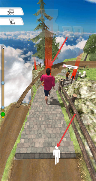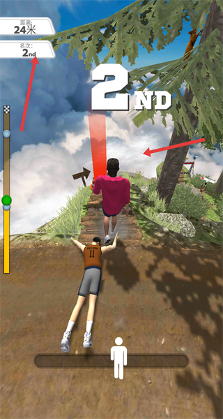 2、進入比賽后操控角色在賽道上奔跑,留意前方的路徑與障礙,盡量保持快速前進,同時關注界面顯示的距離和名次信息。