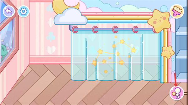3、進入室內場景后,界面右側的小人圖標可觸發角色相關操作,這里是裝扮或布置室內空間的區域,可通過對應功能按鈕調整場景內的裝飾元素。