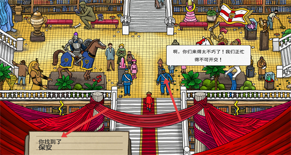 2、在場景里觀察畫面細節,找到提示對應的角色,比如保安,點擊該角色完成識別,此時界面會給出找到目標的反饋提示。