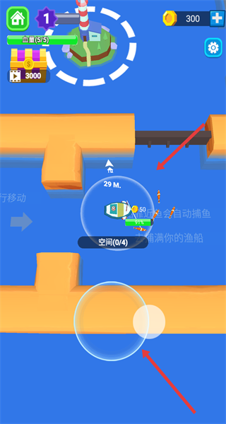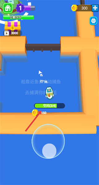 2、在移動船只的過程中靠近水域中的魚類,此時船只會自動進行捕魚操作,同時注意船只的空間容量,合理收集魚類。