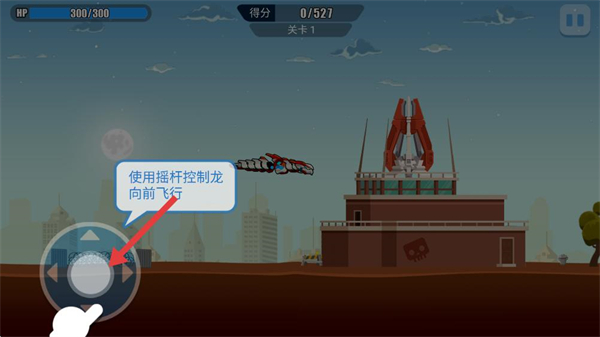 2、進入關卡1界面,通過操作搖桿控制機甲龍向前飛行,界面會顯示HP和得分進度,操控搖桿可調整飛行方向,推進游戲進程。