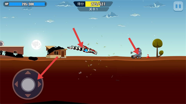 3、在飛行過程,機甲龍可撞擊場景中的建筑或敵人,完成互動后會增加得分,同時HP可能因碰撞減少,持續操控搖桿保持飛行推進關卡。
