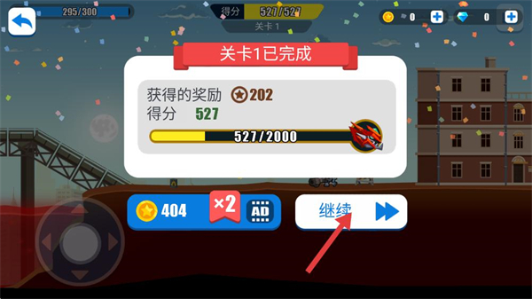 4、關卡1完成后,界面會顯示獲得的獎勵和最終得分,點擊繼續按鈕可進入后續流程,獲取獎勵。