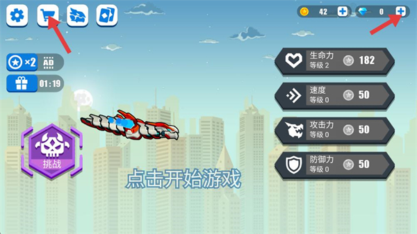 1、在游戲主界面,點擊頂部購物車圖標可進入商城頁面,界面會顯示機甲龍的屬性數據,同時左側有挑戰按鈕,可按需選擇功能入口推進操作。