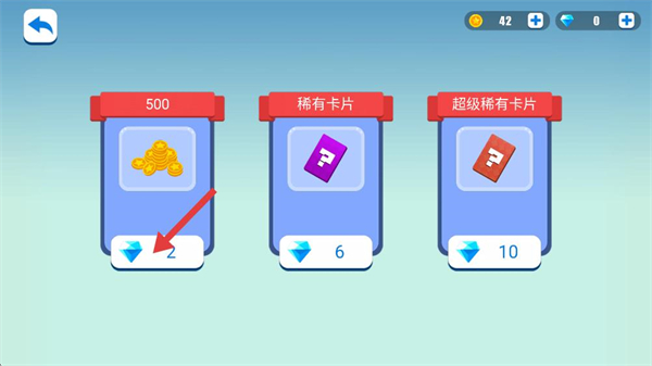 2、進入商城后,能看到不同道具選項,如500金幣需消耗2鉆石,稀有卡片消耗6鉆石,超級稀有卡片消耗10鉆石,可根據需求選擇對應道具。