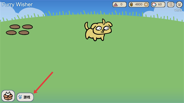 1、進入主界面后,點擊底部【游戲】按鈕可打開功能菜單,該按鈕是進入各類玩法的入口,界面會顯示當前寵物與資源狀態,操作前可先確認基礎信息再推進。