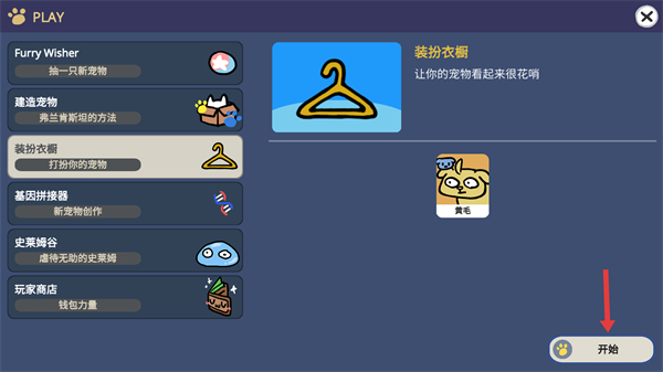 2、在功能菜單中選擇【裝扮衣櫥】選項,點擊右側【開始】按鈕即可進入裝扮界面,該玩法可給寵物更換外觀裝飾,按需選擇裝飾類型能提升寵物展示效果。