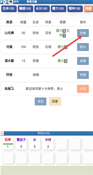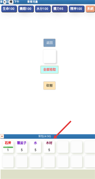4、資源收集并拾取完成后,可查看背包確認資源到賬,之后可選擇繼續在該區域進行其他資源操作,或返回主界面安排后續事宜。