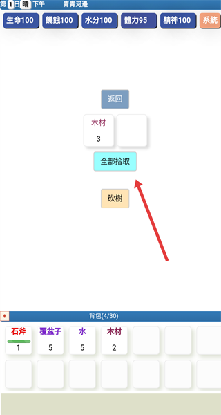 3、完成資源收集操作后,界面會顯示獲得的資源,點擊全部拾取按鈕,將獲得的資源收入背包。
