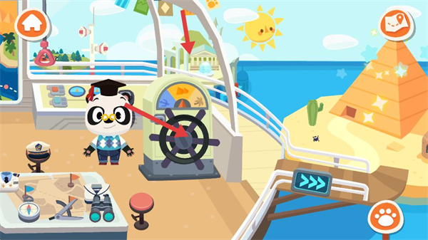 2、進入船內場景,可看到方向盤等互動元素,點擊方向盤等裝置能觸發對應互動,同時場景中還有各類裝飾與道具,豐富游玩體驗。