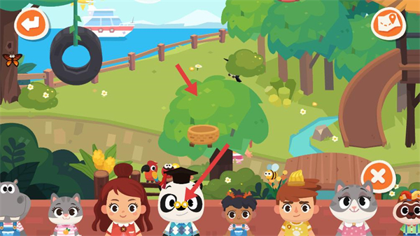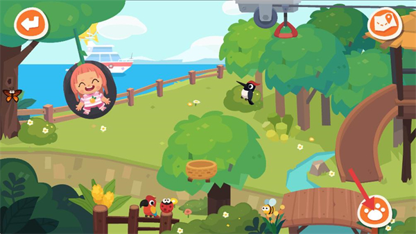 3、切換至戶外場景,能看到秋千、動物等元素,點擊場景內的互動按鈕,可觸發角色或場景物品的互動效果,推進游玩進程。