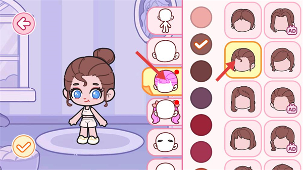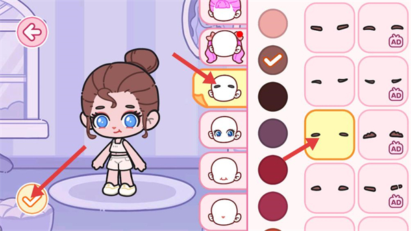 3、切換至臉部裝扮板塊,可選擇不同臉部樣式,點擊對應選項更換角色臉部形象,搭配右側的表情選項,豐富角色外觀,操作后點擊對勾確認。