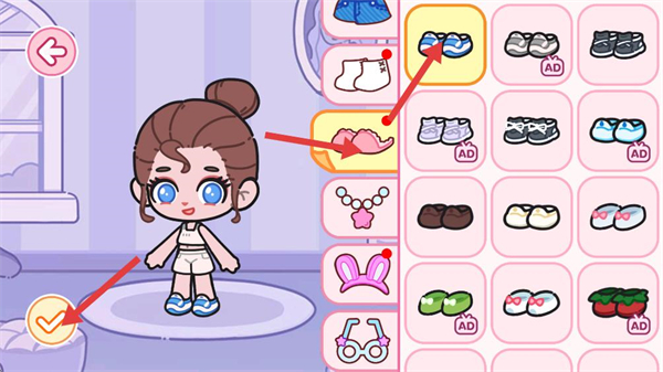 4、進入服飾裝扮板塊,可選擇鞋子等服飾配件,點擊對應樣式即可更換角色鞋子,完成裝扮后點擊左下角對勾,確認所有裝扮設置。