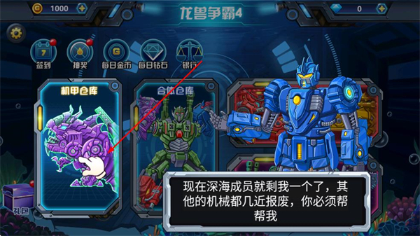 1、打開龍獸爭霸4深??衲в螒蜻M入主界面,點擊機甲倉庫選項,進入機甲倉庫頁面,查看展示的機甲及相關提示信息。