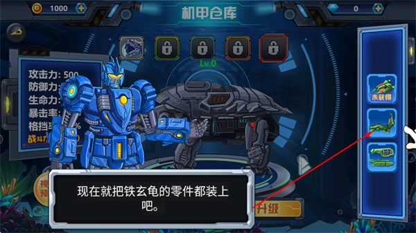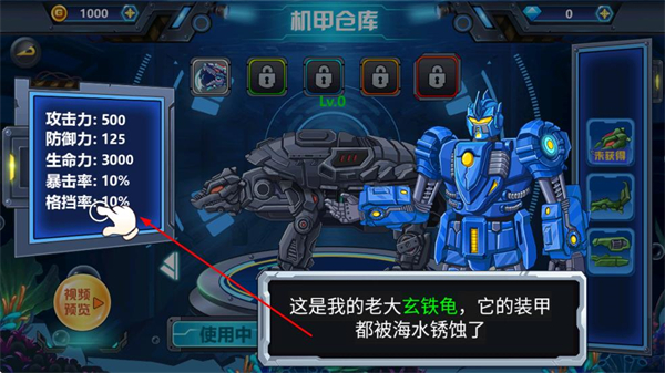 2、機甲倉庫頁面查看玄鐵龜的屬性面板,了解其攻擊力防御力等數值,同時查看界面中的提示內容。