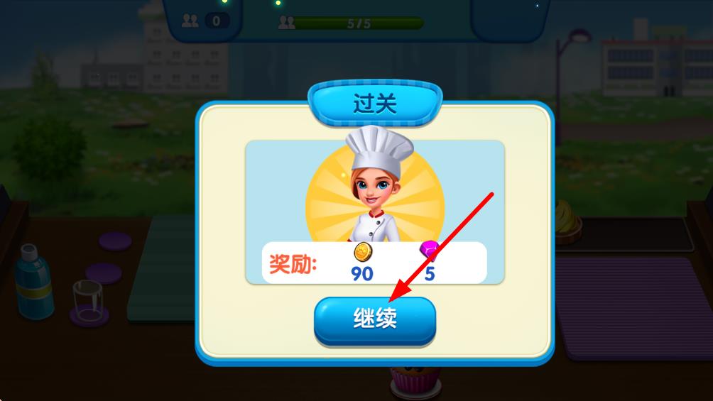 4、完成關卡目標后會出現過關界面,展示獲得的金幣與鉆石獎勵,點擊繼續按鈕可進入下一個關卡,繼續進行美食經營的游戲挑戰。
