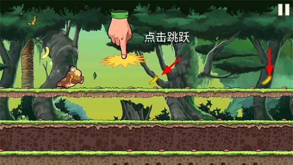 2、繼續在多層平臺的叢林里前進,按照點擊跳躍的指引操作,讓猩猩在不同平臺間移動,途中能不斷收集分布在各處的香蕉。