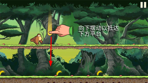 3、遇到多層平臺時,按照向下擺動的提示操作,控制猩猩從上方平臺移動到下方平臺,這樣能抵達新區域,同時收集下方的香蕉。