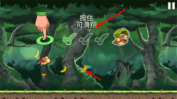 4、在移動的過程,看到按住可滑翔的提示,按住對應區域,猩猩會進入滑翔狀態,借助滑翔能更順利地移動,同時收集更多香蕉。