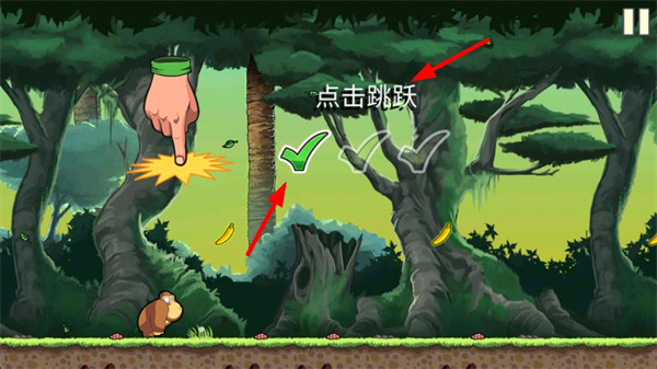 1、操作猩猩在叢林場景移動,看到屏幕上的點擊跳躍提示,點擊對應區域,猩猩會跳躍起來,同時可以收集沿途的香蕉。