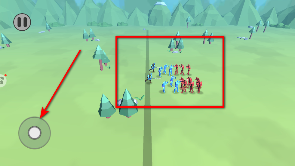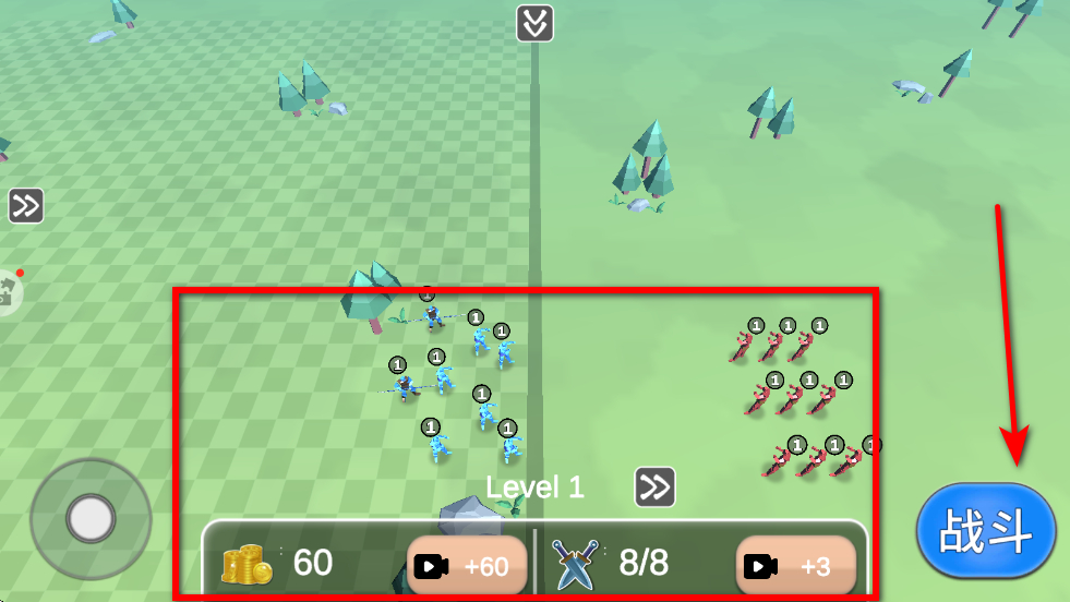 1、進入關卡后,能看到己方藍色士兵和敵方紅色士兵,界面下方有金幣和士兵數量顯示,確認好兵力后點擊戰斗按鈕,就能開啟雙方的對戰。