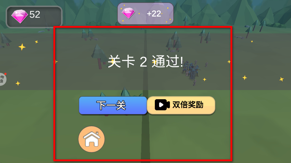 4、關卡通過后,會顯示通關提示,同時出現下一關雙倍獎勵和主頁按鈕,選擇下一關可繼續游玩,選雙倍獎勵能獲得更多資源,點主頁則返回主界面。