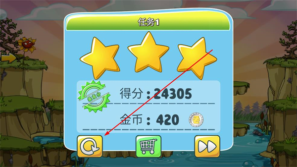 4、成功擊退所有僵尸后,彈出任務結算界面,獲得三星評價及對應得分、金幣,可選擇重新挑戰或進入下一關。