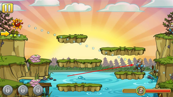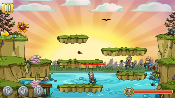2、關卡場景中操控攻擊裝置瞄準靠近的僵尸,發射攻擊道具命中目標僵尸,阻止其靠近植物。