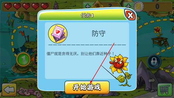 1、打開植物僵尸守衛戰游戲,進入任務1界面,查看防守任務提示,點擊開始游戲按鈕進入關卡。