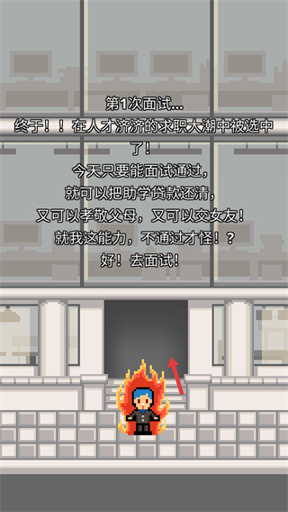 1、進入游戲后,觸發首次面試劇情,角色帶著還款、盡孝等目標前往面試,這類職場模擬玩法以劇情推進為核心,后續需通過互動完成面試流程。