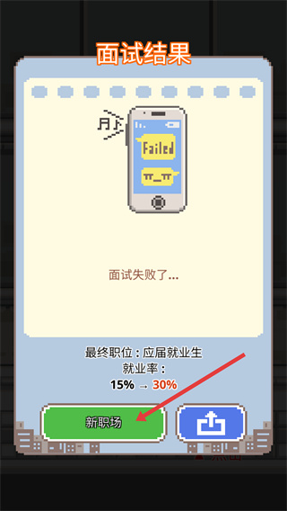 2、面試失敗后會顯示結果界面,同時就業率會提升,點擊新職場按鈕可重新挑戰面試,這類機制允許重復嘗試,積累進度以推進職場進程。