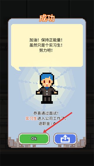 3、面試通過后會獲得實習生職位,點擊Ok按鈕確認即可進入職場場景,這是職場模擬的核心節點,后續可通過職場互動提升職位與資源。