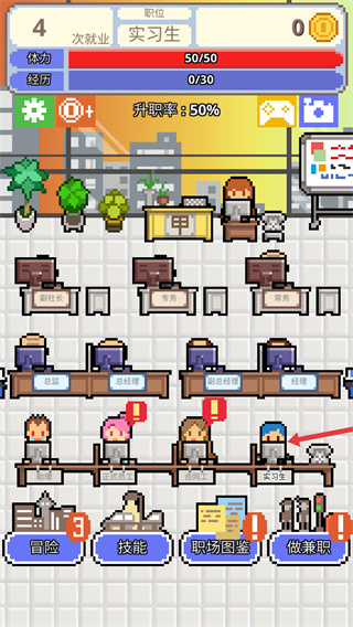 4、進入職場界面后,可查看體力、經歷等屬性,通過冒險與做兼職等功能積累資源,提升升職率,逐步從實習生向更高職位晉升,推進職場成長。